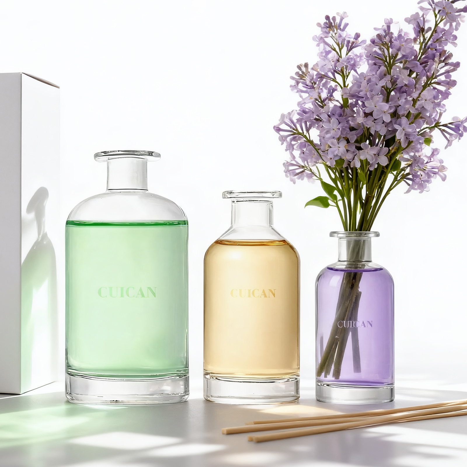 This is a square glass diffuser bottle in various sizes. It is made of high-quality glass and has a transparent and pure appearance. The shape is simple, elegant and generous. It is suitable for a wide range of applications, including home settings such as bedrooms, living rooms, and bathrooms, as well as commercial places like restaurants and hotels. The sizes range from small to large, meeting your different needs. The wide bottle opening design allows for the simultaneous placement of multiple fiber rods, enabling the fragrance to quickly spread throughout the entire room.